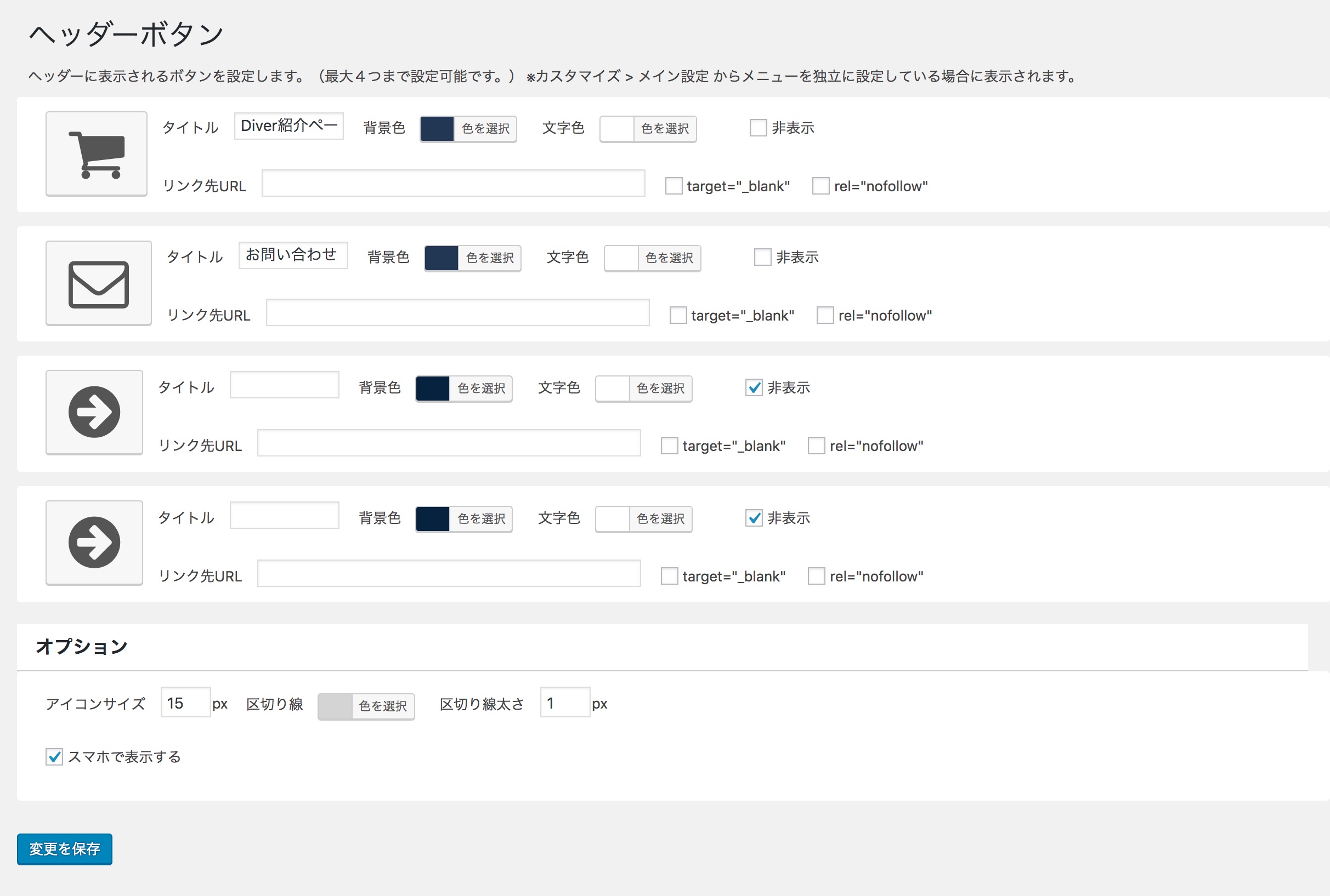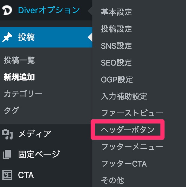 WordPressの管理画面にログインし、メニューの中にある「Diverオプション」-「ヘッダーボタン」をクリックします。